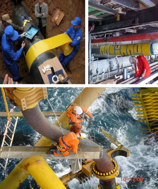 潮間區(qū)立管最易受到海水的浸蝕,采用傳統(tǒng)修復(fù)補(bǔ)焊、換管等工藝需要大量的物質(zhì)和人員配合,還需要?jiǎng)踊鹩绊懮a(chǎn)。而采用MKT-8復(fù)合管道修復(fù)技術(shù)修復(fù),只需要2名材料安裝人員,在不影響生產(chǎn)作業(yè)的情況下在較短時(shí)間內(nèi)就能完成整個(gè)修復(fù)作業(yè)工作。并且經(jīng)過培訓(xùn)的水下作業(yè)人員可以很容易的潛入海下,對(duì)海下管道進(jìn)行修復(fù)作業(yè),因?yàn)槲夜具x用的特種材料具有直接應(yīng)用于水下的特殊能力。在國外的平臺(tái)管道修復(fù)有著豐富的工程案例。